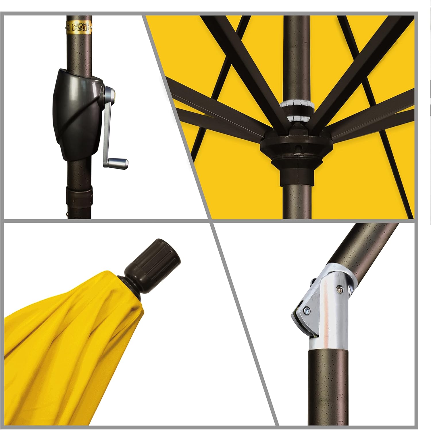 | Model Name | California Umbrella 9' Round Aluminum Market Umbrella, Crank Lift, Push Button Tilt, Bronze Pole, Sunbrella Sunflower Yellow |
