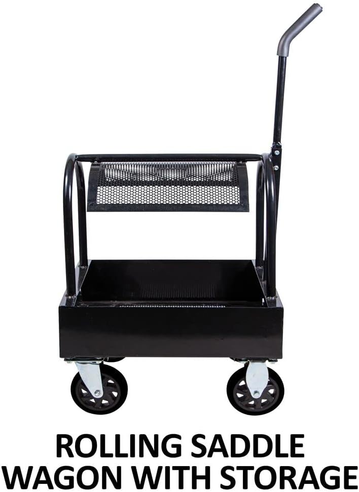 The Easy-Up Saddle & Grooming Box Cart is a versatile and practical solution for all your saddle storage and grooming needs. It can accommodate both Western and English saddles, and features a built-in storage box measuring 22" long, 18" wide and 6" deep. The storage box has a perforated metal floor that lets dirt and debris fall through, keeping your boots and grooming supplies cleaner. The cart comes with 6" solid rubber caster wheels that make movement a breeze, with two steering wheels at the front for easy maneuvering and two stationary wheels at the back for stability on unlevel surfaces. Made from durable 1" tubing with a black powder coat finish, this saddle and grooming box cart also comes with an industry-leading 5-year warranty.